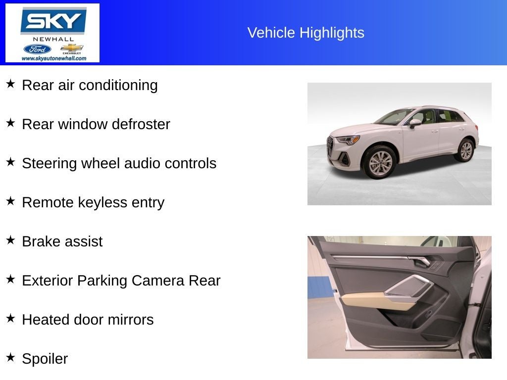 Behind the wheel, the Q3 Premium delivers a smooth, confident ride with responsive handling that makes driving feel effortless. Audi’s signature attention to detail shows up in the quiet cabin, advanced technology, and seamless connectivity that help keep you informed and entertained without distraction. Safety and peace of mind are built into every drive, giving you confidence no matter where the road takes you.