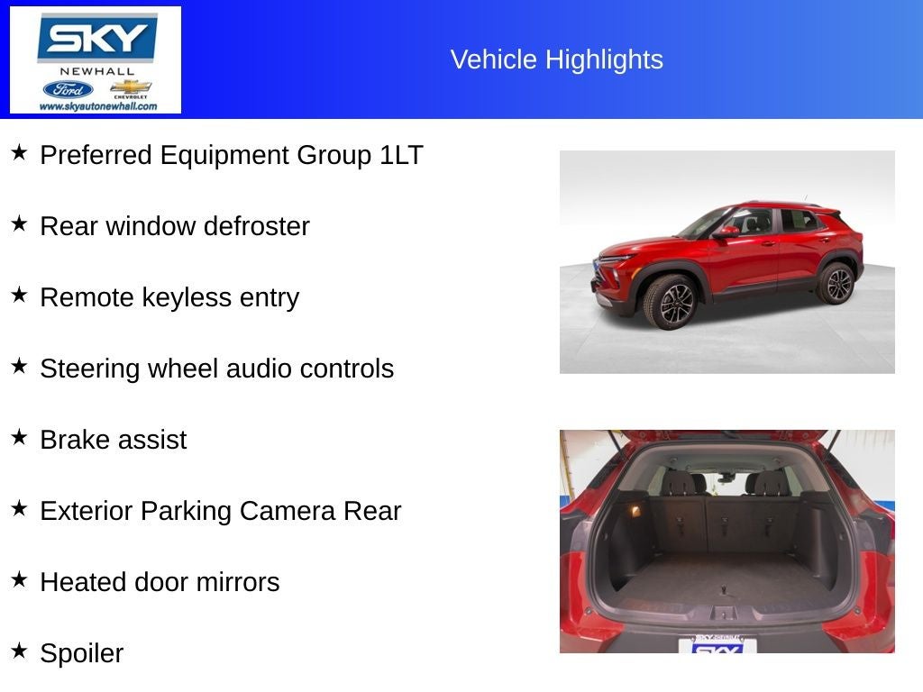 The 2025 Chevrolet TrailBlazer LT is a smart, stylish SUV designed to keep up with everyday life while adding a little extra confidence to every drive. Its bold exterior stands out without trying too hard, while the comfortable, thoughtfully designed interior makes both quick errands and longer road trips feel easy and relaxed. The TrailBlazer LT offers a smooth, responsive driving experience that feels just as comfortable in the city as it does on the highway. With modern technology that keeps you connected and convenient features that make daily driving simpler, this SUV strikes a great balance between practicality and personality. It’s a versatile choice for drivers who want comfort, capability, and a fresh, modern feel all in one package.