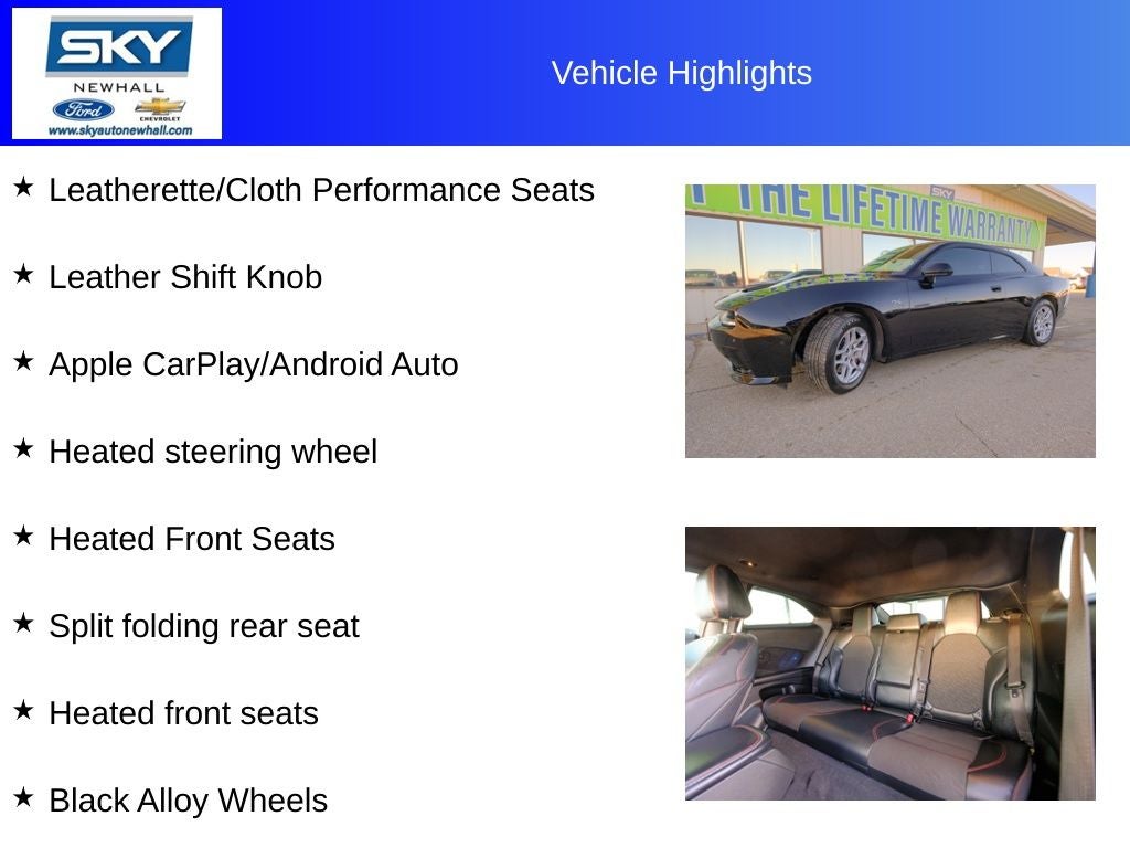 AWD, Black Artificial Leather, Apple CarPlay/Android Auto, Black Alloy Wheels, Brake assist, Heated door mirrors, Heated Exterior Mirrors, Heated Front Seats, Heated front seats, Heated steering wheel, Leather Shift Knob, Leatherette/Cloth Performance Seats, ParkView Rear Back-Up Camera, Quick Order Package 25M R/T, Rear window defroster, Remote keyless entry, Split folding rear seat, Steering wheel audio controls.